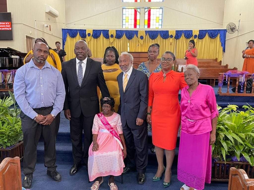 Today, members of the department to include Ms. Dale O’Brien Director, Mr. Gerard Brookes and Mrs. Serena Copiel Thomas North Zone Field Officers, the department’s Tech Team, Hon. Melford Nicholas Parliamentary Representative for St. John’s City East who is also Minister of Information, Communication Technologies, (ICT’s), Utility and Energy along with His Excellency Sir. Claire Roberts Governor Generals Deputy joined with the family, friends and well-wishers of Ms. Victoria Salomie Rhodes in a service at the St. John’s Seventh Day Adventist Church to celebrate a milestone that not so many have the opportunity to celebrate.
